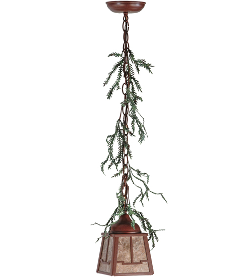This stunning Nature-inspired pendant is handcrafted with a Silver Mica lantern attached to a chain accented with Green hand painted pine needles and complemented with handsome Rust finished hardware.Although wired for an incandescent bulb, we provide an energy efficient LED lamp to save energy, reduce re-lamping and maintenance, and provide a long-lasting life of 50,000 hours.