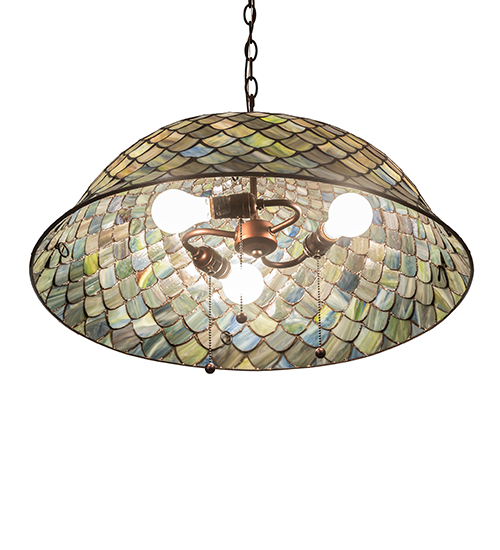 A Tiffany Studios classic. The Fishscale pattern is reproduced in variegated glass of Honey dripped Emerald, Sapphire, Amber and Mauve, evoking a unique dimensional and textured look in a rainbow of brilliant hues. This exquisite art glass shade is complemented with a Mahogany Bronze. This exquisite variegated art glass shade is created using the famous Meyda Tiffany copperfoil construction process. The overall height ranges from 14 to 49 inches as the chain length can be easily adjusted in the field to accommodate your specific lighting application needs. UL and cUL listed for dry and damp locations. Each shade is a unique work of art with color variations based on natural ingredients inherent in the glass. Contact us if color matching is critical when ordering multiple items.