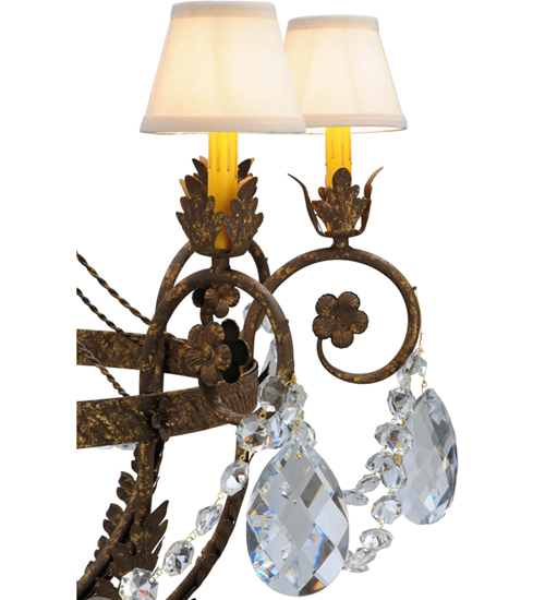 Exquisite styling and luxurious charm are reflected in this elegant Antonia Chandelier which embraces 8 Amber faux candlelights which are crowned with Natural Linen shades and enhanced with faceted crystal charms, scroll arms, Acanthus leaf accents and rich Pompeii Gold finished hand-forged Iron hardware. This chandelier features quality materials and hand detailed American craftsmanship perfected by years of time honored artistry, passed down from generations of highly skilled artisans. Custom sizes, styles, colors and dimmable energy efficient lamping options such as LED are available. The fixture is UL and cUL listed for damp and dry locations.