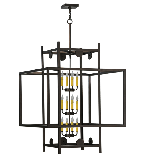Great lighting begins at the intersection of rectangular and square forms where an elegant candelabra pendant suspends with four faux candlelights on each of three tiers. A Mahogany Bronze finished frame was custom engineered and built by Meyda for a designer who will provide four vertical panels of glass that fit perfectly into specially designed insets. ?An architectural wonder in lighting.