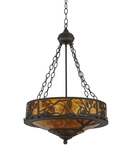 Listen closely.You can almost hear the soft whisper of the pine branches as they dance in the wind.Enjoy the warm ambiance of soft beautiful light diffused through this rustic pendant?s Amber Mica featuring stunning pinecone and pine branch designs. Hand finished in handsome Oil Rubbed Bronze and handcrafted by Meyda Artisans in Yorkville, New York.Create the design, colors, and the size and style of your choice.Energy efficient lamping options available.
