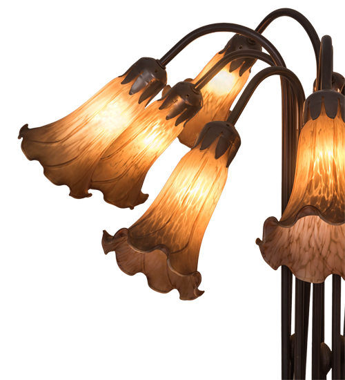 One of the most popular Louis Comfort Tiffany styled lamps on the market today, recreating his famous Favrile design from the early 1900's. This mottled rich Amber shaded Ten Light Table Lamp offers an attractive, delicate design featuring shades mouth blown of fine art glass. Lily shades are suspended from stems delicately winding above a Lily pad base finished by hand in Mahogany Bronze.