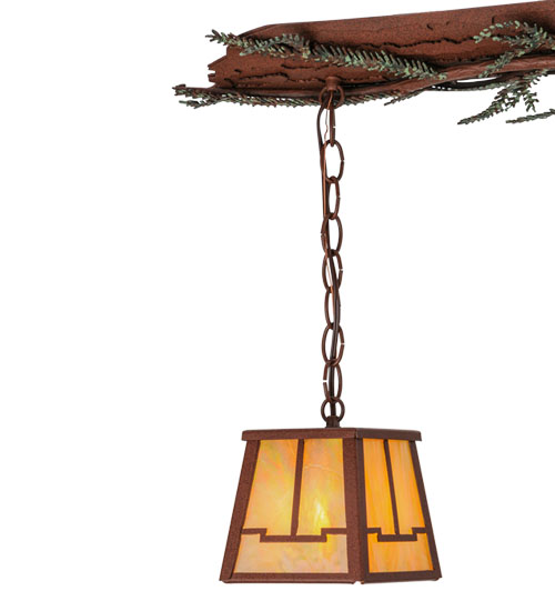 Invite the natural charm of the American woodlands into your home, camp, lodge, or business with this stunning island pendant. 2 Beige Iridescent Glass lanterns with a handsome Arts & Crafts design adorn Green Handpainted Pine Branch shaped accents with matching Pine Needles on this unique Nature Inspired fixture. This striking ceiling fixture features a Rust finished Barkerized ceiling canopy to create a mesmerizing effect. Island for lighting islands, bars and counters. Overall height ranges from 9 to 38 inches as the chain can easily adjust in the field. Domestically produced in our 180,000 sq ft manufacturing facility in Yorkville, NY. Customize shade colors, metal finishes and sizes. UL and cUL listed for damp and dry locations.