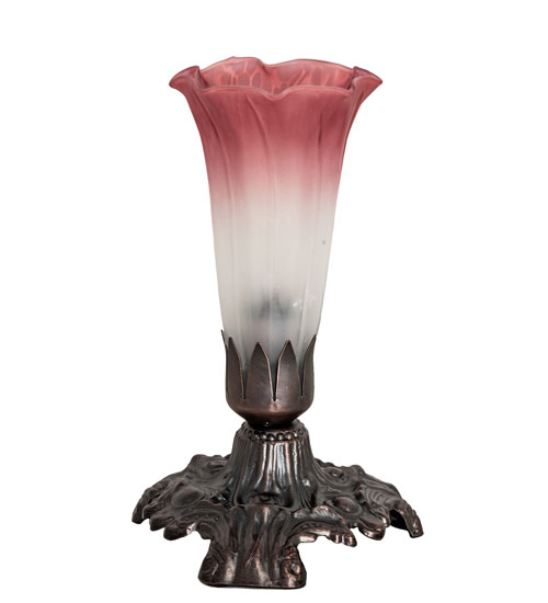 One of the most popular Louis Comfort Tiffany styled lamps on the market today, recreating his famous Favrile design from the early 1900's. This softly mottled Plum Pink and White shaded One Light Accent Lamp offers an attractive, delicate design featuring a shade of mouth blown of fine art glass. Lily shades are seated in an elegant base finished by hand in Mahogany Bronze.