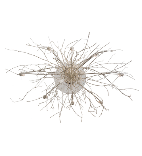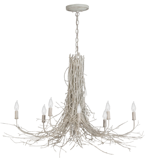 Meyda artisanship embraces Mother Nature. An illuminating candelabra with White faux candlelights appears to bud and grow from Benjamin Moore Mascarpone White White twigs and branches harvested by hand from low hanging, tree-friendly sun growth in the Adirondack mountains. All natural materials are hand woven like wicker around a rugged steel frame which suspends the chandelier from ceiling. Ideal for lobbies, entrance ways and other large interiors.