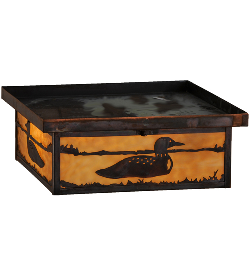 This Craftsman Signature ceiling fixture features stunning images of aquatic birds splashing in a lake captured in this wildlife inspired Beige art glass on side panels with Frosted Seeded glass diffuser on bottom of fixture.Brass fixture is complemented with a frame and hardware hand finished in Vintage Copper.Handmade by Meyda Craftsmen in the Yorkville, NY manufacturing facility. Custom colors, styles and sizes available. Energy efficient lamping options.