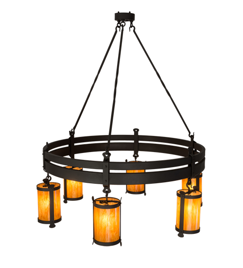 Integrating an elegant style with a classic distinguished look. The chandelier is custom crafted with six Ambra Siena Idalight Cylindres with Beartooth-like metal accents. The fixture is enhanced with a rugged curved frame in a Wrought Iron finish. Handcrafted in our 180,000 square foot manufacturing facility in Yorkville, NY. Fixture designs, metal finishes and chandelier sizes can be customized to meet your needs. UL and cUL listed for damp and dry locations.