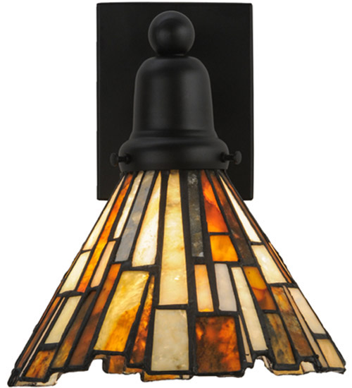 Thinly hand carved and polished natural Jadestone in earthy tones of Moss Green, Tan, Natural Ivory and Coral become luminescent in this unique tile patterned sconce shade and complemented with wall fixture backplate and hardware finished in Solar Black. The natural stone shade is crafted using the famous copperfoil construction process that creates Tiffany stained glass lamps and fixtures. UL and cUL listed for dry, damp and wet locations.