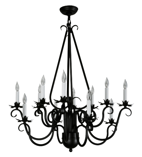 Exquisite grace and luxurious beauty blend to create the distinctive Caleb Chandelier. Adorning this elegant chandelier are 12 White faux candlelights perched on floral bobeches. The fixture is complemented with Hand-forged Iron scrolled arms in a bold Black finish. Perfect for an entryway, lobby, banquet hall or conference room. The overall height ranges from 37 to 97 inches as the chain length can be easily adjusted in the field to accommodate your specific lighting application needs. Handcrafted by highly skilled artisans in our 180,000 square foot manufacturing facility in Yorkville, New York. Candlelight colors, metal finishes and fixture sizes can be customized. UL and cUL listed for dry and damp locations.