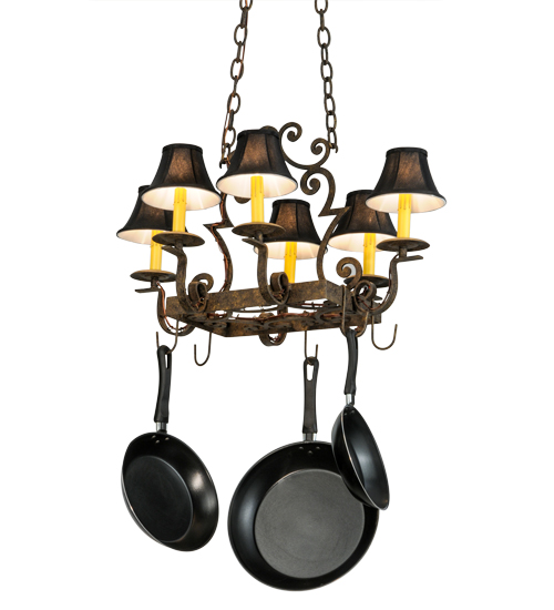 Luxurious elegance meets function with this unique kitchen lighting fixture. 6 Amber faux candlights crowned with Black Trumpet shades perched on bobeches are embraced by this Antiquity finished oblong frame and enhanced with exquisite scrolled arms. Hooks are designed to suspend fine cookware on this fixture, which is handcrafted in the USA by highly skilled artisans and featured in an authentic Antiquity finish. Custom sizes, styles and colors are available, as well as dimmable energy efficient lamping options such as LED. This 28-inch long fixture is UL and cUL listed for dry and damp locations. (Cookware not included)