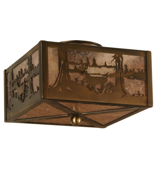 A graceful Buck meanders by a lake in the woods in the beautiful afternoon sun. This nature inspired square shaped ceiling fixture features Silver Mica Panels and is enhanced with an Antique Copper finish. The Deer at Lake Flushmount is Domestically produced in our 180,000 square foot manufacturing facility in Yorkville, NY. Customize metal finishes, shade colors and fixture sizes to your taste. UL and cUL listed for dry and damp locations