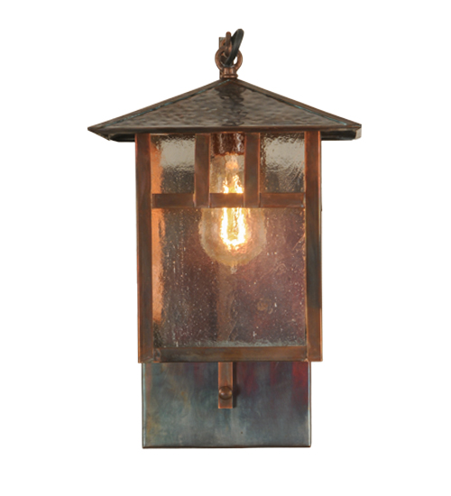 Custom Crafted of Solid Brass.Mission inspired straight lines and a hammered peaked roof are depicted as a handsome American Craftsman Signature style.Ambient light projects through Clear Seeded art glass enhanced with Solid Brass hardware and frame featured in a Vintage Copper finish.Ideal for covered porches, entryways and hallways.Handcrafted by Meyda artisans in the Yorkville, NY manufacturing facility at the foothills of the Adirondack Mountains. Custom colors, styles and sizes available.Energy efficient lamping options.