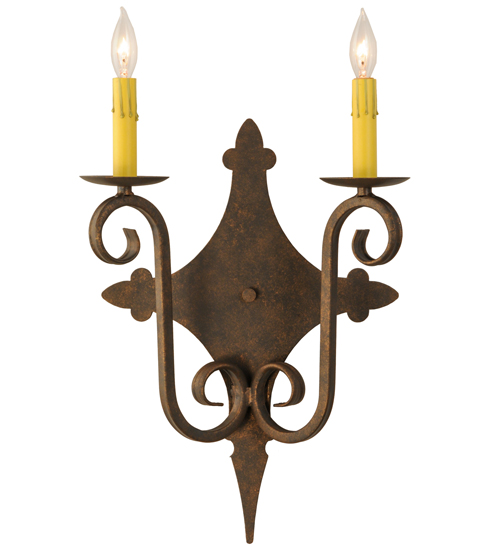 Rich charm and and elegance come to light with Angelique, a wall sconce designed as a dramatic accent for a hallway, entryway or any other room. This enchanting wall fixture features two Amber faux candlelights perched on bobeches, with scrolled arms and stylized diamond shaped hardware featured in a Gilded Tobacco finish. Handcrafted by highly skilled artisans in our Upstate New York manufacturing facility, this fixture is available in custom sizes, styles, colors and dimmable energy efficient lamping options such as LED. This exquisite wall luminaire is UL and cUL listed for damp and dry locations.