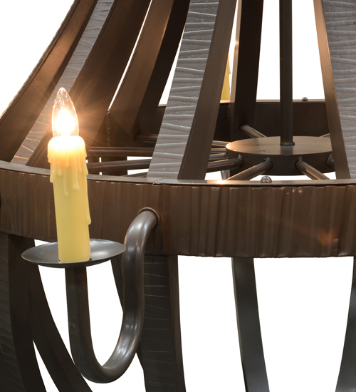 Rugged rustic charm blends with Gothic beauty. Inspired by Antique Wooden staves traditionally bound by wooden or metal hoops in the construction of beer/whisky barrels and wine casks. Timeless Bronze finished solid stout curved arms support bobeches accented with Ivory faux candles which line up like soldiers at attention in abeyance of the barrel to which they serve. Ideal for lobbies, foyers, banquet rooms and reception areas. Custom crafted by highly skilled artisans in our 180,000 square foot manufacturing facility in Yorkville, New York. UL and cUL listed for dry and damp locations.
