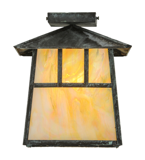 Custom made from Solid Brass, a stunning Craftsman Signature design statement is emphatically presented with a striking Mission straight line design on this lantern. Highlighted with Beige Iridescent art glass and a frame and hardware finished in Verdigris. Ideal for indoor and outdoor lighting applications. Handcrafted by Meyda artisans in the Yorkville, NY manufacturing facilities at the foothills of the Adirondack Mountains. Custom colors, designs and sizes available. Indoor and outdoor applications.