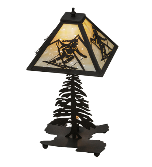 A winter skier slaloms down the slopes during an epic skiing event with a mountain range in the background. Warm ambient lighting is diffused beautifully through Beige Iridescent glass enhanced by a frame and Pine tree base featured in a Dark Roast finish. This lamp is ideal for nightstands, occasional tables and desks. Handcrafted in the Meyda manufacturing facility, located at the foothills of the Adirondack Mountains, not far from Lake Placid, home of the 1980 Winter Olympics. Custom designs available, as well as energy efficient lamping.