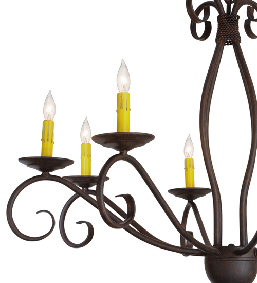 Designed as an elegant statement centerpiece for any room, this Sienna chandelier features 8 Amber faux candlelights that are perched on bobeches with scrolled accents. This lovely custom fixture features a decorative hub and luxurious hardware in a Cajun Spice finish. Quality materials and hand detailed American craftsmanship are perfected by years of time honored artistry, passed down from generations of highly skilled artisans in the USA. This lighting fixture is available in custom sizes, styles, colors and dimmable energy efficient lamping options. Sienna is UL and cUL listed for dry and damp locations.