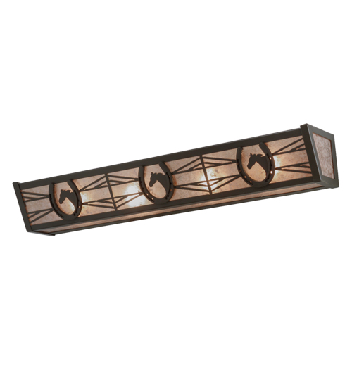 Horse portraits framed with lucky horseshoes are designed and crafted across this handsome fixture. Warm ambient light projects through stunning Silver Mica which is accented by a geometric design styled after fencing commonly found at horse stables. Decorative hardware and accents are enhanced in a bold Timeless Bronze finish. Perfect for a vanity light in a bath or a sconce in hallways, entryways and foyers. The fixture is handcrafted by Meyda artisans in the USA. Custom sizes, styles and colors are available, as well as dimmable, energy efficient lamping options.