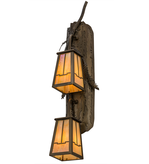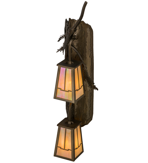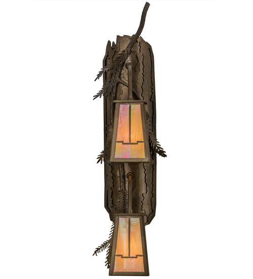 Enjoy the natural beauty of the American woodlands with this stunning two-light wall luminaire. Designed with steel Pine tree branches with Pine needles, the hardware is featured in an Antique Copper finish. Two stunning Arts & Crafts styled lanterns feature Beige Iridescent art glass with an abstract view of the valley design. Handcrafted by Meyda artisans at the foothills of the Adirondack Mountains, this sconce is available in custom sizes, styles, colors and dimmable energy efficient lamping.