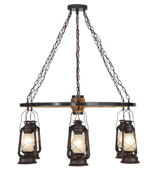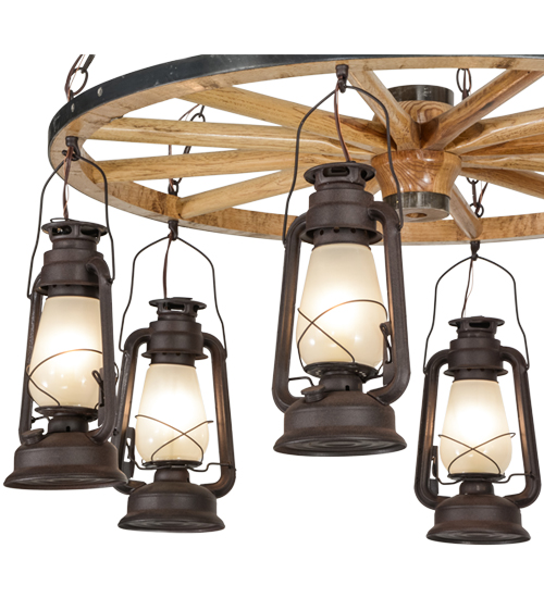 Exuding rustic Western charm and personality, this dramatic wagon wheel chandelier is a hand-crafted treasure with six traditionally styled Miner Lanterns featuring Clear Frosted glass diffusers and authentic detailed profiles and hardware finished in a Distressed Rust. Ideal for a lobby or entryway in a rustic home, lodge, inn or other commercial space. Handcrafted by highly skilled Meyda artisans in the USA.