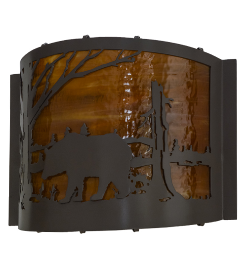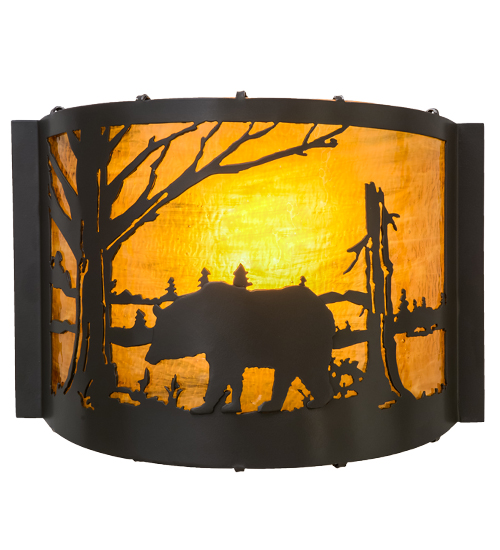 A large majestic Bear struts his stuff around the shoreline of a mountain lake as the morning sun rises at dawn. This naturally inspired wall sconce is designed with Honey art glass and a frame and hardware finished in Timeless Bronze. The rustic lighting is custom crafted in the USA, at the foothills of the Adirondacks.