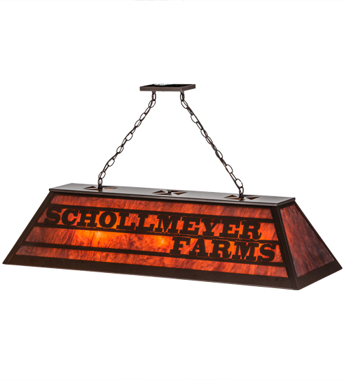 The distinctive Schollmeyer Farms pendant was custom crafted in upstate New York with an oblong Ambra Siena Idalight shade, which is complemented with accents and hardware feature in a Cafe Noir finish. The fixture is ideal for illuminating kitchen islands, counters, dining tables and billiard rooms. UL and cUL listed for dry and damp locations. Lighting fixtures can be custom designed in nearly any color, style or size to meet your exact specifications. Personalized items are shown as examples of our craftsmanship (only.) They are not for sale 'as is' but can be customized to fit your personal needs.