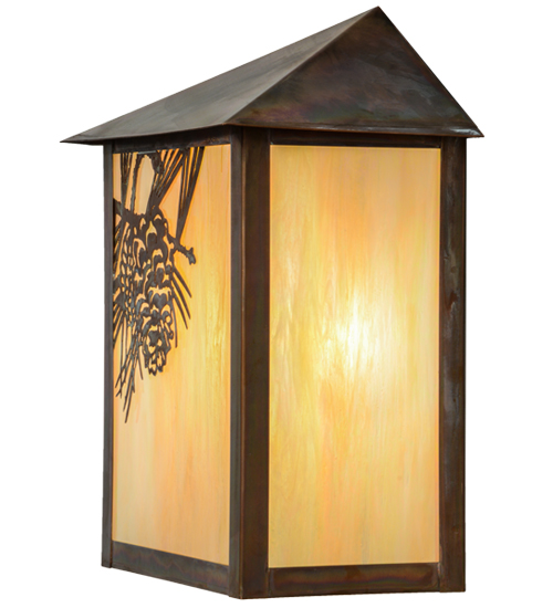 A Winter Pinecone with Pine Needles delicately etched of Solid Copper. Rustic charm comes alive with soft ambient light projected through a stunning Beige Iridescent Glass diffuser. The nature inspired interior/exterior wall sconce is complemented with Vintage Copper finished hardware. Handcrafted in our 180,000 square foot manufacturing facility in Yorkville, New York. Diffuser colors, metal finishes and fixture sizes can be customized to your needs. UL and cUL listed for dry, damp and wet locations.