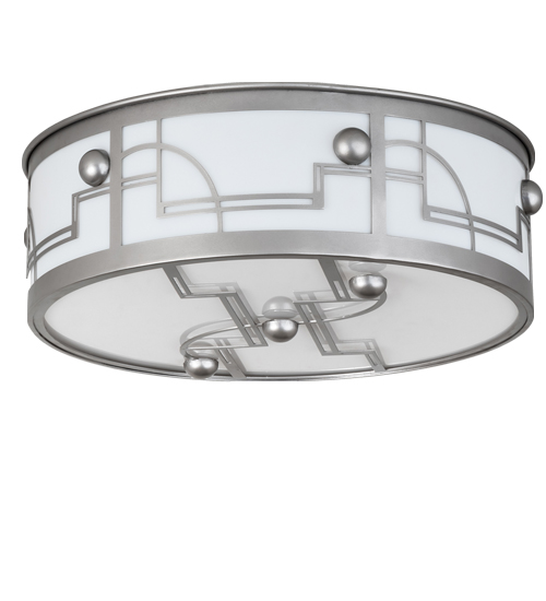 This fanciful fixture with straight lines and curving shapes is reminiscent of the high art of the Art Deco era. The ceiling flushmount is finished in a Nickel powdercoat, features Statuario Idalight panels, and is handcrafted in the USA by highly skilled artisans. Special sizes, colors, styles, sizes and dimmable energy efficient lamping options such as LED are available. The fixture is UL and cUL listed for dry and damp locations.
