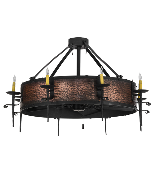 Innovation never looked so good with this breathtaking custom lighting fixture that integrates ceiling fan technology. This rich handsome design is featured in our award winning Chandel-Air collection. Enjoy beautiful light evoked from a Hand Hammered Blackened Textured Copper banded fixture which is complemented with a Costello Black finish. Eight Ivory faux candlelights for decorative lighting and eight downlights for task lighting. Gentle breezes are produced by the fan spinning quietly in the center. In summer, the fan pushes down a windchill that circulates to keep the space cool and comfortable. In winter, the fan is reversed to pull the room air up towards the ceiling and force the warm air back down and circulate to create warmth.