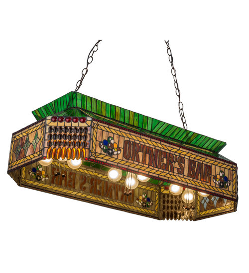 Offering a stunning stained glass design, this beautiful oblong pendant features the Ortner's Bar name in White lettering on an Emerald Green background. This art nouveau design features diamond-shaped designs and rows of Green, Red, Clear, and Amber glass jewels throughout the shade, which was constructed using the famous Meyda Tiffany construction technique a rhapsody of geometric shapes and stunning colors. The fixture is enhanced with a Mahogany Bronze finished hardware. The overall height ranges from 25 to 47 inches, as the suspension chain can be easily adjusted in the field to meet your lighting requirements. The oblong pendant is ideal for illuminating billiard tables, bars, islands, counters, and dining tables in residential and hospitality locations. The Personalized Ortner's Bar Oblong Pendant is featured in our American-designed, handcrafted Personalized Lighting Collection and manufactured in Yorkville, New York. UL and cUL listed for dry and damp locations. This personalized item is shown as an example of our craftsmanship and is not for sale 'as is' but can be customized to fit your needs.