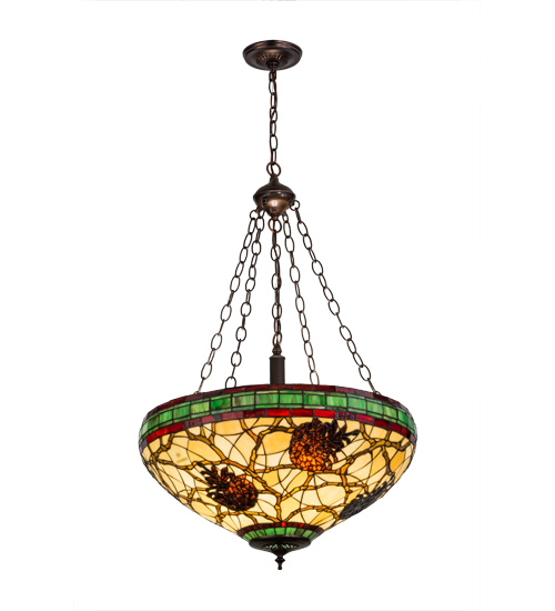 This stunning design features the iconic pinecone, one of Mother Nature's most compelling organic symbols, which offers a natural elegance and represents the evolution of human enlightenment. Burgundy and Leafy Green bands edge this woodland art glass shade that highlights Light Brown pinecones and branches on a Golden Sun background. The shade, which is created using the famous Meyda Tiffany copperfoil construction process, is enhanced with hardware finished in Mahogany Bronze. Custom styles, colors, sizes and dimmable energy efficient lamping options are available.