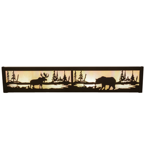 A majestic Moose and a Bear meander alongside a mountain lake as the late afternoon sun casts a golden glow, create a picture postcard image for all to enjoy. Eye-catching White Iridescent art glass is featured on the lens as Blue art glass is displayed on the lower diffuser. This fixture, which features decorative accents and hardware in an Oil Rubbed Bronze finish, is perfect as a vanity in a bath or lighting hallways as a sconce. This fixture is custom crafted by Meyda artisans at the foothills of the spectacular Adirondack Mountains in Upstate New York. Custom sizes, styles and colors are available, as well as dimmable, energy efficient lamping options.