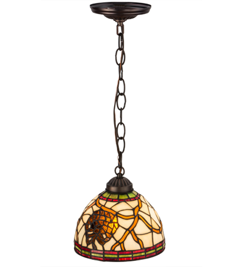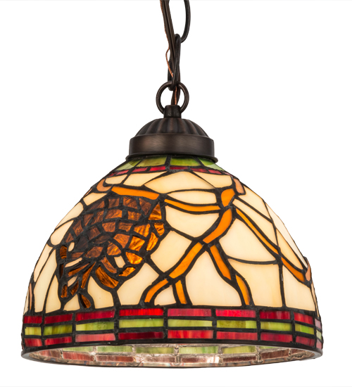 This stunning art glass design features the iconic pinecone, one of Mother Nature's most compelling organic symbols for natural elegance and human enlightenment. Burgundy and Forest Green bands edge this woodland shade that is highlighted with Brown pinecones and Bark Brown branches on Beige stained glass. The shade is created using Meyda Tiffany's famous copperfoil construction process and enhanced with hardware that is accented with pinecone and pine needles hand finished in Mahogany Bronze.
