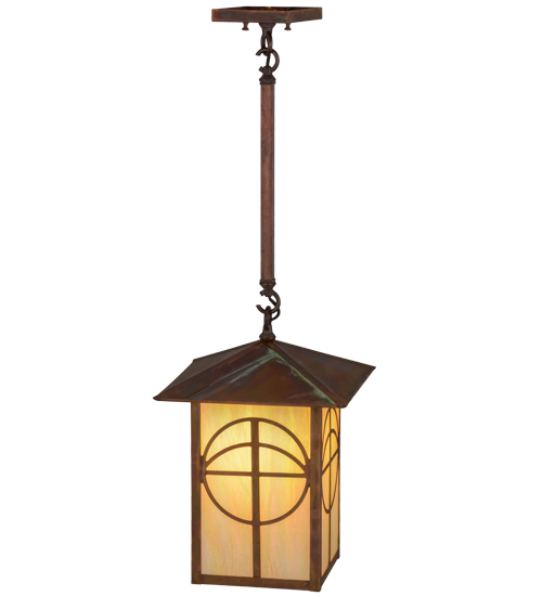 Custom crafted of Solid Brass, crosses intersect circular designs that are combined with a Mission styled profile featured in this handsome American-made Craftsman Signature design. Ambient light projects through Beige Iridescent art glass enhanced with Vintage Copper finished hardware and frame. Ideal for indoor and outdoor lighting applications, this lantern is handmade by Meyda artisans in the Yorkville, NY manufacturing facility at the foothills of the Adirondack Mountains.Custom sizes, colors, styles and energy-efficient lamping are available.