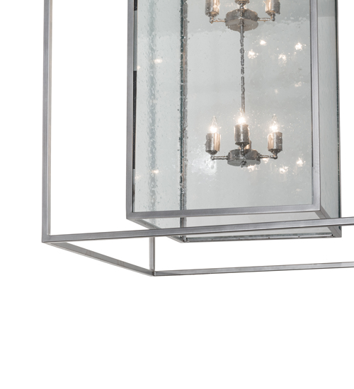 A sophisticated architecturally styled fixture is designed with a pizazz that is unique, fresh and stylish. Give your decor an extra edge with this breathtaking fixture, which is highlighted with a solid steel structure that surrounds a Clear Seeded Glass box featuring eight faux candlelights. The detailed hardware and frame are featured in a Nickel finish. Handmade in our 180,000 square foot manufacturing facility in Yorkville, New York. Available in custom sizes, styles and finishes, as well as dimmable energy efficient lamping options. UL and CUL listed for damp and dry locations.
