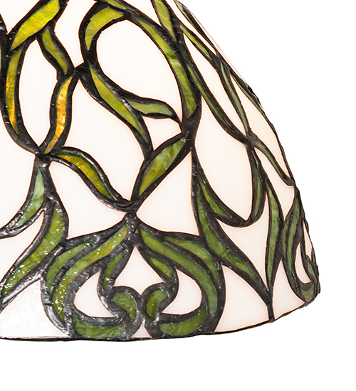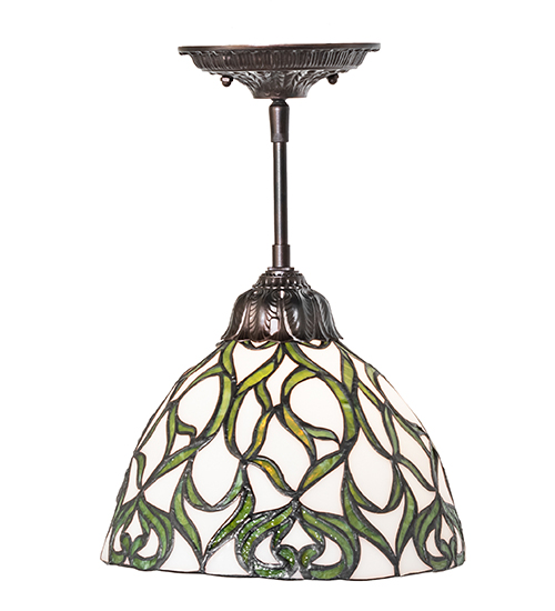 Spring Green leaves and vines with Tulip Medallion accents adorn this splendid Whisper White chandelier. The stunning shade is created using the famous Meyda Tiffany copperfoil construction technique and complemented with a Mahogany Bronze finish. The fixture is enhanced in Mahogany Bronze finish. To create a dramatic design statement, install these mini pendants in groups to illuminate bars, counters, and kitchen islands in residential, commercial, and hospitality settings. The overall height can be adjusted by combining the four stem lengths that are included: 6-inch, 12-inch, 16-inch, and 24-inch, in any combination to achieve the desired drop from the ceiling. The Grand Tulip Medallion Mini Pendant is featured in our American-designed, handcrafted Stained Glass Lighting Collection. UL & cUL listed for dry and damp locations. Each shade is a unique work of art with color variations based on natural ingredients inherent in the glass.