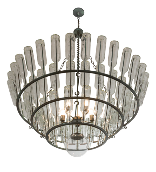 Capture the life of the party with the whimsical design of the Meyda Wine Bottle Pendant. It's so much fun that you may want to hang from it, but don't! Liven up a restaurant, club, or home with a light fixture that does so much more than deliver light; it adds personality and pizzazz. Seventy-Six Clear Glass wine bottles are embraced by a three-tier frame hand-finished in Verdigris. The massive fixture is perfect for lobbies, entryways, and other spaces in homes, restaurants, hotels, pubs, nightclubs, and wineries. Discerning connoisseurs will appreciate this fixture's fine detail and charm. The overall height ranges from 70 to 130 inches, as the chain can be easily adjusted in the field to meet your exact lighting requirements. This rich-looking Tuscan Vineyard 3 Tier Chandelier is included in our American-made, American-designed, handcrafted Wine Bottle Lighting Collection. The fixture is manufactured in Yorkville, New York. UL and cUL listed for dry and damp locations. Please send us your favorite branded wine bottle, and Meyda will transform it into an everlasting personalized fixture of light. Contact us for more information on custom wine bottle lighting fixtures and lamps. You can also create custom lighting with beer bottles, mason jars, milk bottles, and other glass containers and vessels by contacting us!
