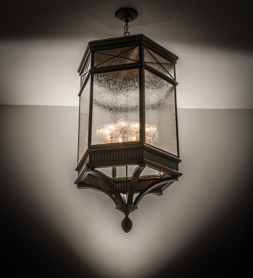 Elegance sophistication is embodied in Newquay, a hanging lantern pendant which features Rainfall Idalight panels and an appealing octagon shaped frame in an Oil Rubbed Bronze finish. Handsome Saltire motifs are depicted on the top of the fixture while an acorn shaped metal finial accents its bottom. Custom options include special sizes, finishes, styles and dimmable energy efficient lamping such as LED. The 36-inch wide pendant is available. UL and cUL listed for damp and dry locations.