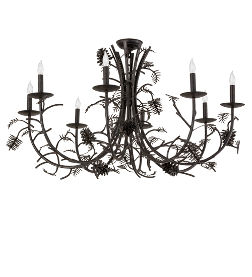 Inspired by the nearby Adirondack Mountains, this breathtaking chandelier features a cornucopia of Hand-forged metal Pinecones and Pine Needles that appear to grow from this tree-like ceiling fixture. The fixture illuminates beautifully with 8 complementary faux candlelights perched on bobeches. The decorative accents and frame are offered in a warm Chestnut finish. Overall height ranges from 26 to 85 inches as the chain can be easily adjusted in the field. The Pinecone Chandelier is included in our American made, American designed handcrafted Rustic Lighting Collection. Manufactured in Yorkville, New York. UL and cUL listed for dry and damp locations.