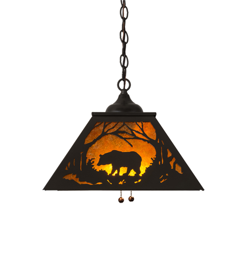 This Nature Inspired pendant depicts a majestic Bear wandering through the woodlands as the sun rises in the warm summer sky. Beautiful ambient light projects through an Amber Mica shade, which is complemented with hardware and decorative accents featured in a Timeless Bronze finish. This charming pendant is ideal for illuminating dining and kitchen areas in fine homes from Northwestern Montana, Northern Utah, and Northwestern Washington. The overall height ranges from 14.5 to 44 inches, as the chain can be easily adjusted in the field to meet your specific lighting applications. The Bear at Dawn Pendant is included in our American-made, American-designed, handcrafted Wildlife Collection, which is manufactured in Yorkville, New York. UL and cUL listed for dry and damp locations.