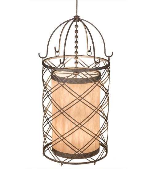 Geometric diamond patterns are revealed by a spiraling metal frame that encircles a cylindrical diffuser featured in a stunning Fleshtone Idalight. The exquisite frame and matching hardware are featured in a lustrous Corinth finish. Handmade by expert artisans in the USA, custom sizes, styles and finishes are available, as well as dimmable energy efficient lamping options such as LED. This lovely 62-inch pendant is UL and cUL listed for damp and dry locations.