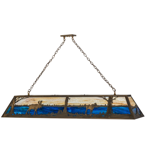 A majestic Moose meanders in the woodlands as the Blue-Green mountain lake sparkles in the late afternoon sunshine against the Beige sky, creating an image that is perfect for a picture postcard or great work of art. This oblong pendant features a stunning elegant art glass shade that is complemented with decorative accents and hardware featured in an Antique Copper finish. The fixture is perfect for illuminating kitchen islands, dinettes, islands, billiard tables, counters and bars. This pendant is custom crafted by Meyda artisans at the foothills of the spectacular Adirondack Mountains in Upstate New York. Custom sizes, styles and colors are available, as well as dimmable, energy efficient lamping options. The fixture is UL and cUL listed for dry and damp locations.