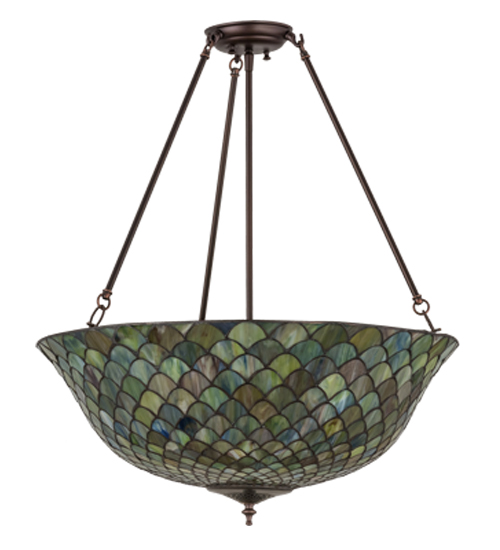 A Louis Comfort Tiffany studio classic Fishscale pattern reproduced in variegated glass of Honey dripped Emerald, Sapphire, and Garnet, evoking a unique dimensional and textured look in a rainbow of brilliant hues. This exquisite art glass shade is complemented with Mahogany Bronze hand finished hardware. The fixture is a versatile pendant to complement any color or style of interiors. Custom sizes and styles are available, as well as dimmable lamping options.