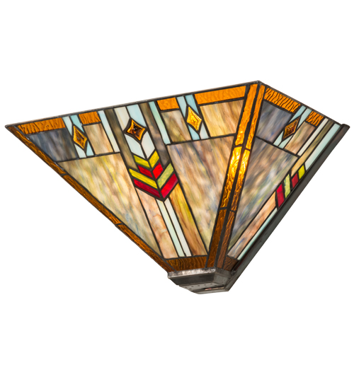 This stunning Mission style wall sconce features a geometric pyramid-shaped shade with ""Cats Paw"" art glass, enhanced with Gray, Blue, Green and Purple hues, and Sky Blue accents around diamond shaped Amber cast glass jewels. Burgundy and Green glass chevrons highlight the design, which is trimmed with Amber Ripple glass. The shade was created with authentic art glass using the famous Meyda Tiffany copperfoil construction process. Custom colors, sizes, styles and dimmable energy efficient lamping options are available.