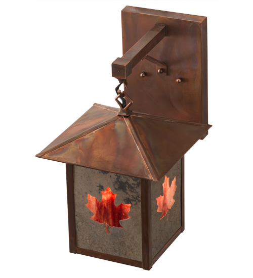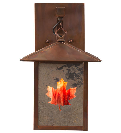 The glass for this item is discontinued. Please Call to explore other options. Custom crafted of Solid Copper, this fixture features a stunning Maple Leaf design in fiery Autumn Red/Yellow art glass on a diffuser created with Optyka-Lite, which combines natural stone from exotic mines around the globe with luminous glass-like backing. Available in transparent and opaque finishes, Optyka-Lite features a unique, mineral-like textured look. These fixtures are complemented with a Frosted Seeded glass bottom diffuser and hardware featured in a Vintage Copper finish. Options include custom designs, sizes, colors and dimmable energy efficient lamping. The fixture is UL and cUL listed for damp and dry locations.