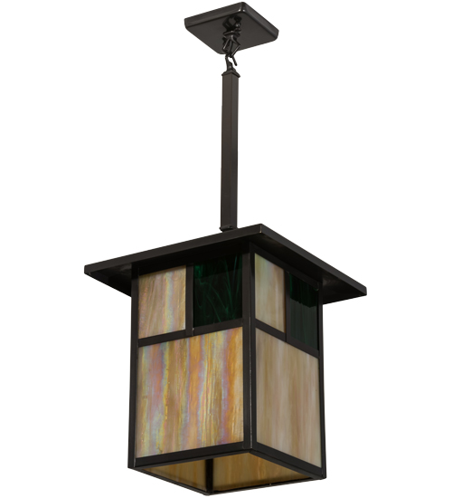 Handcrafted from Solid Brass, this handsome Craftsman Signature fixture is inspired by the Arts and Crafts movement. The striking Mission straight line design is featured in Beige Iridescent art glass with Green art glass accents, and enhanced with a frame and hardware finished in a handsome Craftsman Brown. The fixture is perfect for both indoor and outdoor applications and handcrafted by Meyda artisans in the Yorkville, NY manufacturing facilities, at the foothills of the Adirondack Mountains. Custom sizes, styles, colors and lamping options are available. The fixture is UL and cUL listed for dry and damp locations.
