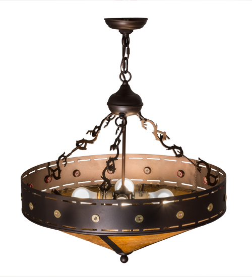 A Brass Shotgun Shell accented band embraces stunning Amber Mica diffuser panels and is suspended from handcrafted metal branch accented chain links. This handsome inverted pendant is finished in Mahogany Bronze. The overall height of this pendant ranges from 27 to 57 inches as the chain length can be easily adjusted in the field to accommodate your specific lighting application needs. The Craftsman Target fixture is Domestically Produced in the USA at our Yorkville, NY manufacturing facility. Shade colors, metal finishes and fixtures sizes can be customized to your taste. UL and cUL listed for dry and damp locations.