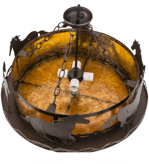 A herd of Wild Horses circle a Teepee as they roam the Great Plains. This stunner of a pendant, detailed in its decorative artistry, is designed with accents and hardware featured in a Mahogany Bronze finish. Beautiful ambient light is projected through the Amber Mica shade and matching bottom diffuser. The Teepee entrance is peeled back with Faux Rawhide-wrapped Leather Shade revealing an Amber Mica light diffuser, with matching side & bottom panels. The perimeter is accented with Faux Barb Wire accents. Overall height ranges from 42 to 162 inches as the chain can be easily adjusted. The Pendant is included in our American made, American designed handcrafted Western Lighting Collection. Manufactured in Yorkville, NY. UL and cUL listed.