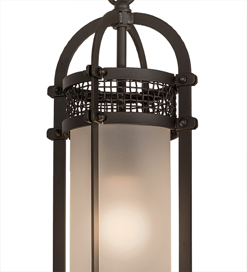 A handsome styled Clear Frosted glass cylindrical form is crowned with a caged frame, mesh and hardware which are featured in an Oil Rubbed Bronze finish. Handcrafted in Yorkville, New York, this fixture is available in dimmable energy efficient lamping options, as well as custom sizes, styles and colors.