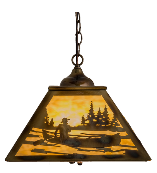 An eye-catching serene design that depicts a sportsman paddling his canoe down a gentle mountain stream. This ceiling pendant features a Beige Art Glass shade enhanced with a frame and decorative accents in a stunning Light Burnished Brass Tint finish. The ceiling pendant is ideal for beautiful ambient illumination above a table or island in your home, lodge, restaurant, or business. Overall height ranges from 15 to 62 inches as the chain easily adjusts in the field. The Canoe at Lake Pendant is included in our American-made, American-designed, handcrafted Sporting Life Collection. Manufactured in Yorkville, New York. UL and cUL listed for dry and damp locations.